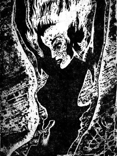 And she was sinking faster. Now knee-deep, thigh-deep, hip-deep, waist-deep. She beat at the powdery path with her hands and threw her body from side to side in agonized frenzy like some sinner frozen in the ice of the innermost circle of the ancients' hell. And always the sense of the dark, grainy tide rose inside as well as around her.