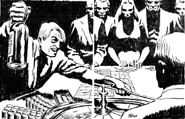 Nobody did, but that was okay anyhow. Grinning happily, he made bets for them. One of the women—the one that was redheaded—looked to him as if she might be a plunger. He shoved her pile of chips over onto zero and then he gave her a friendly little wink. The other woman was the careful type, he thought. Her chips—not all of them, of course—he shoved for red. He disposed of the man perfunctorily: ten dollars on plain number nine. His own bet was due a little more deliberation. He carefully spread around five hundred dollars until the strip looked as if eighteen people were playing it all at once.