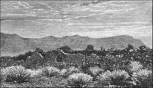Near the lower end of the cañon stands one of the most perfect of these towers, rising sixteen feet above the mound on which it is built. It was once attached to an oblong stone building which seems to have been a strongly-fortified house. The rectangular walls, as usual, are prostrate, and have left the tower standing as solitary and picturesque and as full of mystery as the round-towers of Ireland.