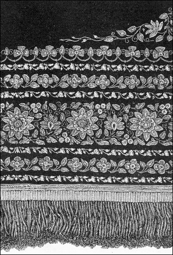 The general attributes of Indian art as displayed in the museum are richness of decoration, great manipulative skill, good taste, brilliancy, harmony of color, intricacy of decorative forms, and the due subserviency of both color and design to [Pg 543] decorative effect. Nearly all these qualities are illustrated by the textile fabrics, the dresses and turbans, the horse and elephant caparisons, the carpets and the rich canopies of the howdahs. These are the tissues that spread the fame of India on every side. It is not known how long it has possessed the art of weaving. Possibly it originated in the Valley of Roses or by the banks of the sacred Ganges. The weaving of silk India appears to have borrowed from China, but when or how it first wove silk we cannot tell, any more than we can tell when first it wove its marvellous gold brocades or gauzy muslins. It was weaving cotton in times beyond the realm of history, and continues weaving it to-day all over the Panjab, Sindh, Rajputana, Oudh, Bengal, the Central Provinces, in Assam, Bombay and Madras. The prince of Wales obtained a few pieces of the famous muslin of Dacca, requiring about six yards to weigh an ounce. Of this kind one was called shabnam, or "dew of the evening," because if laid upon the grass it became undistinguishable from the dew; another was called bafthowa, or "woven air;" a third was called abrawan, or "running water," because when placed in water it became invisible. Even the prince's pieces weigh nearly twice as much as the older tissues. Indian lace in gold or silver, cotton or silk, is in texture and design [Pg 544] the highest representative of that most beautiful fabric. The brocades are glories of color and rich with glittering flowers of gold, and the embroidery on velvet, silk, wool or cotton is both pleasing and rich. The museum contains several examples of the gorgeous embroideries of the Dekkan, and we find in one or two of the costumes and some of the fans a beautiful embroidery of shining green beetle-wings and gold. As to the carpets, they are as a rule satisfying to the eye and possess a general simplicity of design blended with richness of color. In all the more brilliant textile fabrics of India warmth is secured without violence of contrast; and one fact it will be well for Western manufacturers to study—namely, that floral or animal decoration is invariably flat.