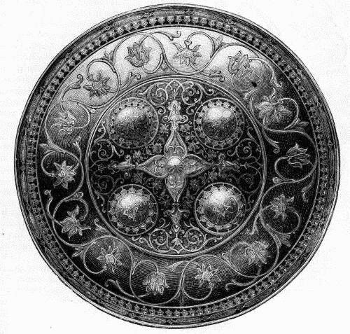 We pass the pottery, merely noting the beauty of the colors, and especially of the turquoise-blue, and the graceful simplicity of some of the early forms, the trappings and caparisons, and glance round the magnificent collection of arms, from the rough robbers' clubs bound with serrated iron to the finest chain-mail and rifles inlaid with gold. From Sindh comes a flintlock gun having the barrel inlaid and plated with gold at the muzzle and breech, and bearing an inscription inlaid in gold. Round the muzzle are set nine uncut rubies, and an emerald forms the "sight." The stock is rosewood, curved and expanding at the butt, enriched with mounts of chased gold, and attached to the barrel by three perforated and chased gold bands. In some cases the woodwork is almost obscured by the gold ornaments. On all sides are weapons richly chased and damascened in gold. Weapons are there of the steel that Persia, and even Damascus, never equalled, and they come, as to a masquerade of the dread weapons of war, with handles of crystal, of jade set with rubies and emeralds, of gold and green enamel set all over with table diamonds, and sheathed in green velvet scabbards gleaming with diamonds and fitted with cap, band and chape of green-enamelled gold.