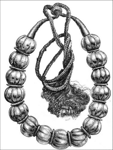 If this people carried such arms, what must their jewelry be? An answer is found in the museum. We again find jade set with emeralds and rubies. From Trichinopoly are gold chains of the snake pattern so finely wrought that the scales are almost invisible, and the chain doubles like thread, or chains and bracelets of rose open-work, most minute and beautiful. From Madras and Delhi comes granulated gold made into ear-drops or set as bosses in open-work. About everything there is a lightness as far removed as possible from Western ideas of handsome solidity and valuable weight. In the museum a model stands for the purpose of showing how the woman of India wears jewelry. She has not only "rings on her fingers and bells on her toes," but in nose and ears, on her hand, dropping over her bosom, round her arms and waist, and loading her ankles, are stringed gems and hoops of gold.