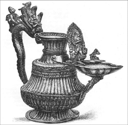 The study of the industrial arts of India, if the warnings of learned Orientalists are to be of any avail, is not a matter to be rashly undertaken. All Indian art must be viewed in reference to Indian religion. Forms, materials and colors have meanings that can only be caught by familiar acquaintance with a symbolism both intricate and obscure. Little decorative touches that to the untaught Western eye are introduced merely to give an artistic finish to an involved design, or to give room for bringing in the bit of color demanded by the sense of harmony, have all a meaning not necessarily connected with art. While in the West the problems of art are dealt with by men whose eyes are bent on art alone, the Oriental artist solves these problems while keeping his eyes fixed upon religion. The maturity of Indian religious life was reached several centuries before our era began: it then took a form which it still retains. There is no secular life from which it can be distinguished. When a domestic utensil is examined, the first question to be answered is, What religious meaning attaches to it? [Pg 533] This is an appalling fact, for it means that the arts of India cannot be appreciated as the Hindus appreciate them until we have mastered an accumulation of mythological and legendary lore such as possibly no other country has amassed.