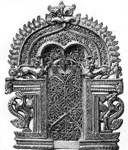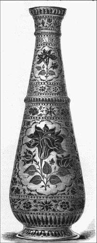 To appreciate the full extent of a task that already seems to hang like a shadow over the whole of what yet remains of one's life, it may be pointed out that the Vedas form only one of four groups of sacred writings, that there are four Vedas, and that each one of the four consists of four parts. Then there are Upa-Vedas, Ved-Angas and Upangas; and under the last-named fall the epics of the Ramayana, of ninety-six thousand lines, and the Mahabharata, of two hundred and twenty thousand long lines, not to mention others. These are mere glimpses into a vista long and dark, and it seems a little odd that one should be called upon to go through so much in order to appreciate a specimen of carving from Vizagapatam, an inlaid table-top from Agra, a box of Cashmere lacquer or a panel of carved sandal-wood from Canara. The fact is, that the matter may be looked at from another point of view—that taken up by those who decline to see anything in a painting but canvas and paint—who care for nothing in the shape of sentiment or story, but have a single eye to art. In this way the beauty and harmony of Oriental coloring, the delicacy and wonderful finish in all manner of carvings, the skill displayed in inlaying and chasing—in a word, all the points of industrial art in India—may be both enjoyed and understood without a reference to the Puranas or the Code of Manu, or without the observer's being able to enumerate the avatars of Vishnu. The inquirer is thus borne up against the deterrent influence of specialists, with the plaintive notes of whose voice he has become in all probability elsewhere familiar. It is the same voice, to all intents and [Pg 534] purposes, that haunts the graves of Egypt, the ruins of Rhagœ, the tombs of Etruria and Magna Græcia, the workshops of King-teh-chin and the mounds of Pachacamac. It is heard, in short, all round the world, and its burden is ever the same: "Understand the religion of a people before peering into their arts." The obvious answer comes: Life is short and art is long: if to art religion be prefixed, all knowledge of art is at an end. It would be pleasant, no doubt, to tell at a glance what legend or myth is represented on a Greek vase, but meantime we can admire the form. It would be equally pleasant to be able to interpret the painting on a Chinese historical vase, but meantime we can admire the colors. So with Egypt, Persia and Peru: it will be well for the many to get at the industrial secrets of these countries if they never obtain even a glimpse of the underlying religious idea of the craftsman.