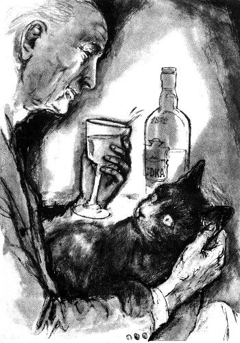 After he cried, he became angry. He wanted to shout, so he left the office early and hurried to his apartment where he could shout without disturbing anyone, which he did. He then took out the vodka, settled Bucephalus, his cat, on his lap and began to pour.