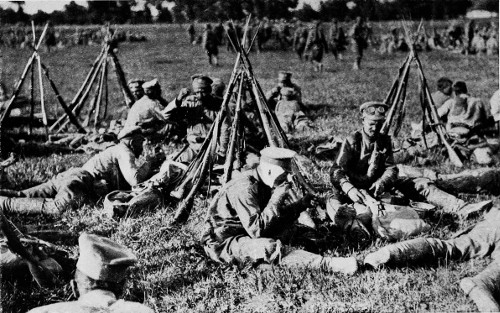 Just east of Sadowa Wisznia, the scene of another Austrian stand, we come upon a regiment 17 attached to the 54th Landsturm brigade. This is the tenth regiment, and, with the exception of a few non-commissioned officers, is composed entirely of Slovaks and Hungarians. They are resting as we motor up, and for nearly a mile they are sitting dejectedly by the side of the road, some with heads resting wearily against tree trunks, while dozens of others are lying in the snow and mud apparently asleep. As nearly as I could estimate, there is about one Russian to a hundred prisoners. In any case one has to look about sharply to see the guards at all. It reminds one a bit of trying to pick a queen bee out of a swarm of workers. Usually one discovers the guard sitting with a group of prisoners, talking genially, his rifle leaning against the trunk of a tree near by.
