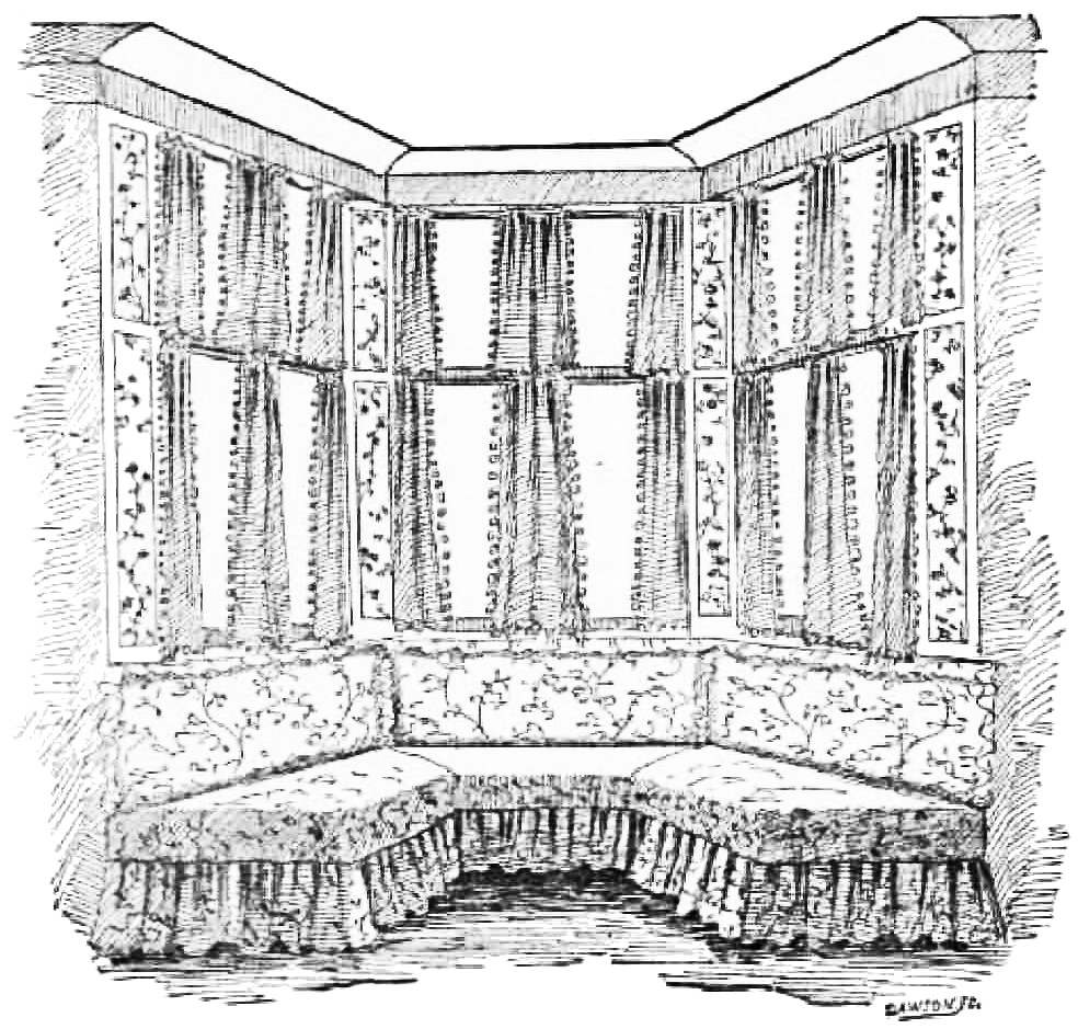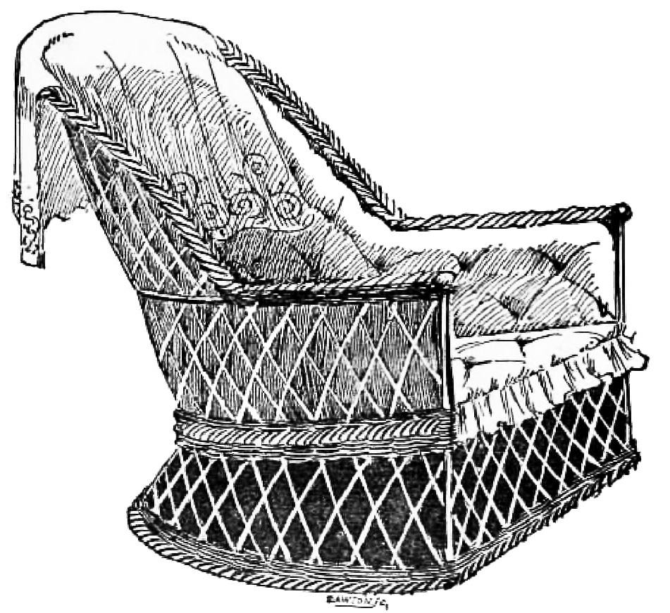 Do you recollect, I wonder, the orthodox dining-rooms of{8} twenty-five years ago?—the heavy, thick curtains of red or green cloth or moreen damask; the tremendous mahogany sideboard, generally with a cellarette underneath it, which, I recollect, made an admirable tomb in which to bury one’s dolls or obnoxious books, generally triumphantly taken from the schoolroom; the chairs that required two people to lift them; the carpet that seemed immovable, and that was too heavy to be shaken more than once a year; and the woolly-bear hearthrug that always smelt of dust, and that was a receptacle for all sorts of cinders, toy-bricks, leaden soldiers, and bones dragged in and buried there by a delinquent dog or cat? Why, the mere shaking of that rug once a week resulted in the discovery of all sorts of treasures that had been lost, and the dust that came out was enough to choke the neighbourhood, and doubtless would have done so had the other inhabitants not all been engaged with their own. Ah! if you do not all of you remember the dining-room of the past, I do; but never without a shudder, or a wonder how we managed to live in such a dark and dusty atmosphere, where work, reading, drawing, and writing all had to be hustled out of sight and out of the way of the parlour-maid, who came to ‘lay the cloth,’ and renew the foul odours, which had only just been exorcised, which breakfast had left behind it to poison the morning with. I should think that domestic furniture was at its very lowest depths of despair then; but that is thirty years ago, or perhaps forty, and nothing turned the tide for quite twenty years!