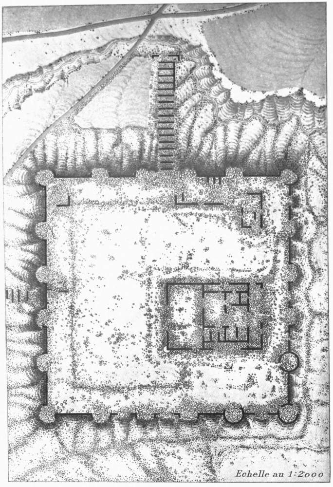 Scarcely more correct as to architectural features is Tavernier’s allusion to Ukhaiḍir. There can, however, be no doubt that it is to Ukhaiḍir that he refers, by reason of the geographical position of his ‘grand Palais’. Coming from Aleppo, he turned off at ‘Ânah into the desert and after some twenty days of journeying he observes:[3] ‘Cinq jours aprés que nous eûmes quitté ces deux familles Arabes, nous découvrîmes un grand Palais tout de brique cuite au feu; et il y a de l’apparence que le pays a esté autrefois semé, et que les fourneaux où on a cuit cette brique ont esté chauffez avec du chaume:{x} car à quinze ou vingt lieües à la ronde il n’y a pas une brossaille ni un brin de bois. Chaque brique est d’un demi-pied en quarré et épaisse de six pouces. Il y a dans ce Palais trois grandes cours, et dans chacune de beaux bastimens avec deux rangs d’arcades qui sont l’un sur l’autre. Quoy que ce grand Palais soit encore entier, il est toutefois inhabité, et les Arabes fort ignorans de l’antiquité ne me sceurent apprendre pour qui il a esté basti, ny d’autres singularitez dont je m’informay, et dont j’aurois bien voulu qu’ils m’eussent instruit. Devant la porte de ce Palais il y a un étang accompagné d’un canal qui est à sec. Le fond du canal est de brique, de mesme que la voûte qui est à fleur de terre, et les Arabes croyent que c’a esté un conduit par lequel on faisoit passer l’eau de l’Euphrate. Pour moy je ne sçaurois qu’en juger, et ne puis comprendre comme on pouvoit faire venir de l’eau de si loin, l’Euphrate estant éloigné de ce lieü-là de plus de vingt lieües. De ce Palais nous tirâmes au nord est et après une marche de quatre jours nous arrivâmes à un méchant bourg, autrefois nommé Cufa et à present Meched-Ali.’[4]