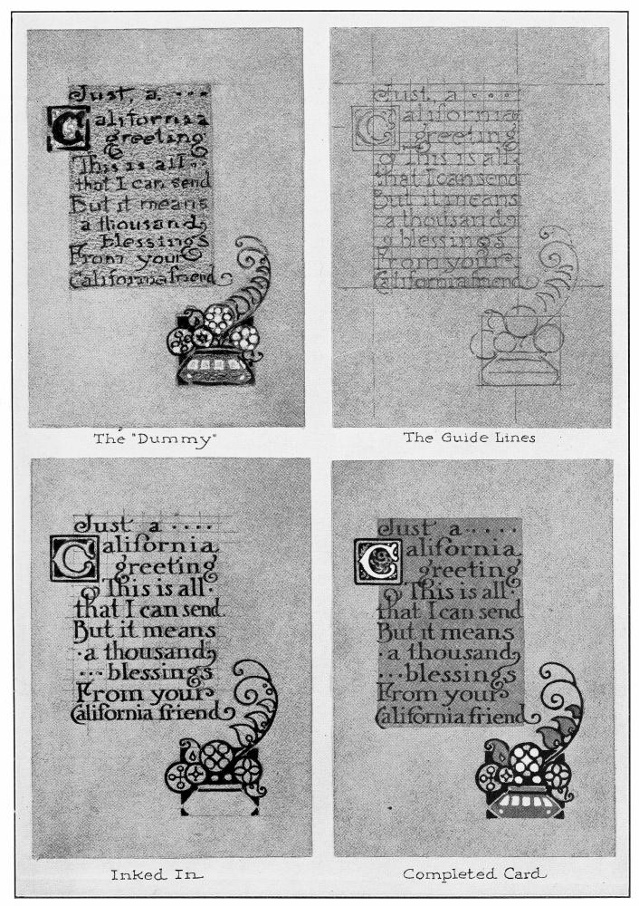 Occasionally, students having a natural bent or enthusiasm for design will be found anxious to produce a card of the style found in Plate 10. In cards of this kind, careful attention must be given to the motifs used and to the placing of these motifs in the general composition. As most of the stress is laid on the design, rather than the lettering, it is important that this design be well planned and equally well carried out. In case of doubt, it is better to leave out some of the ornament rather than have the card overcrowded or ornate.