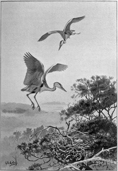 Whenever I can catch at evidence in regard to the sexual relations of birds, it always seems to point in this direction. Take, for instance, that species to which I now devote the rest of this chapter, the moorhen, namely—Gallinula chloropus—for the dabchick has been an encroachment. A very small pond in my orchard of some three half-dead fruit-trees was tenanted by a single pair, who built their nest there yearly. Had it not been for a cat, whose influence and position in the family was fixed beyond my power of shaking, I should have made, one year, a very close study, indeed, of the domestic economy of these two birds; but this tiresome creature, either by the aid of a clump of rushes, amidst which it was situated, or by jumping out boldly from the bank, got at the nest, though it was at some distance, and upset the eggs into the water. As a consequence, the birds deserted both nest and pond, nor did the lost opportunity ever return. A few points of interest, however, I had been able to observe, before the cat intervened. The year before, I had noticed two slight nests in the pond, in neither of 266 which were any eggs laid, whilst the pond itself remained always, as far as I could see, in possession of this one pair of birds only. In the following spring I again noted two moorhens’ nests, in approximately the same situations as before, and now I observed further. During the greater part of the day no moorhens were to be seen in the pond, but, as evening began to fall, first one and then another of these two birds would either steal silently into it, through a little channel communicating with the river, or else out of the clump of rushes where one of these nests had been built. The other one was amongst the half-submerged branches of a fallen tree, the trunk of which arched a corner of the pond. Over to here the birds would swim, and one of them, ascending and running along the tree-trunk, would enter the nest, and sit in it quietly, for a little while. Then it would creep, quietly, out of it, run down the trunk, again, into the water, and swim over to this same clump of rushes, from which, in some cases, it had come. Whether it then sat in the nest there, also, I cannot so positively affirm, but I have no doubt that it did, for I could see it, for some time, through the glasses, a perfectly still, dark object, somewhat raised above the surface of the water. Assuming it to have been sitting in this nest, then it had, certainly, just left the other one, and, moreover, there were the two nests, and only the one pair of birds. For, as I say, I never saw more than two moorhens, at a time, in this pond, which, being very small, was, probably, considered by these as their property. Intrusion on the part of any other bird would, no doubt, have been 267 resented, but I never saw or heard any brawling. The pretty scene of peaceful, calm, loving proprietorship, was not once disturbed.