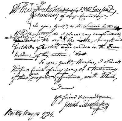 | Illustrations: Statue of James Otis, 69; Jonathan Mayhew, 71; Autograph of Charles Chauncey, 71; George III., 76; Fac-simile of Handbill, Faneuil Hall Meeting, Oct. 28, 1767, 77; of Broadside, The True Sons of Liberty, 78; List of Merchants importing contrary to agreement, 79; Broadside proscribing William Jackson, 80; Revere's Cut of the Landing of Troops in Boston, 1768, 81; John Dickinson, with Autograph, 82; Autograph of James Bowdoin, 83; William Livingston, 84; Liberty Song, 86; Massachusetts Liberty Song, 87; Fac-simile of Instructions to Representatives, signed by Richard Dana and William Cooper, 87; Handbill on the Anniversary of the Boston Massacre, 89; Handbill of Warning, Dec. 2, 1773, 92; Philadelphia Poster about the Tea-Ships, 93; Josiah Quincy's Manuscript Dedication of his Port-Bill Tract, 94; Quincy Mansion, 96; Handbill announcing the Port Bill and Regulating Bill, 97; Handbill of General Brattle's Letter, 1774, 98; Autograph of Thomas Cushing, 99; Signers of the Congress of 1774, 102; Satirical Print, Virtual Representation, 103; Josiah Quincy's Diary, 105; Lord North, 107; Chatham, 109; Richard Price, Portrait and Autograph, 111; Autograph of Lord Dartmouth, 111. | |