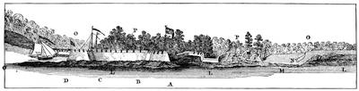 (1.) The fort on the bluff opposite the town "was burnt down in October, 1766", says Pittman (p. 43), who visited Kaskaskia about that time, or soon after, and whose book was published in London in 1770. He gives a description and detailed drawing of the town, the river, and site of the old fort. "It [the old fort] was", he says, "an oblongular quadrangle, 290 by 251 feet; it was built of very thick squared timber", etc.,—using in every instance the past tense. "An officer and 20 soldiers are quartered in the village." The evidence that the old fort was ever rebuilt is wanting.