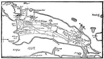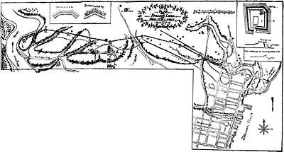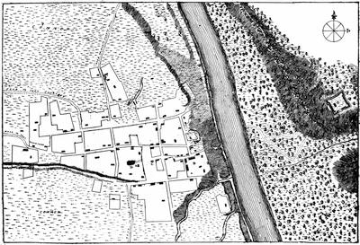 (2.) No incident appears in the contemporary narratives that Clark occupied, or even visited, the site of the old fort; and there are many allusions to his occupying quarters in the town. On one occasion, expecting an attack from the enemy, he resolved to burn the houses around the fort. "I was necessitated", he says, "to set fire to some of the houses in town, to clear them out of the way." The people came to him in distress, fearing he would burn up their town. He took an occasion for doing this when there was snow on the roofs, and only such houses were burned as were set on fire (Campaign, p. 59). The site of the old fort was 500 yards from the river, and the river was 150 yards wide. A fire there would not have endangered the town; and Pittman's plan shows no houses on the eastern bank, around the old fort.