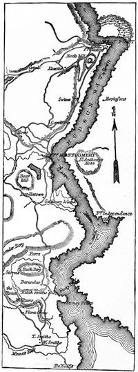 (4.) Clark had heard from the hunters who joined him on the way, and had been in the town eight days before, that the fort was kept in good order, and that the garrison was on the alert. He was too good a soldier, on such information, to divide his scanty force of less than two hundred men into three divisions, and with one of them attack an isolated fort on the opposite side of the river, where he could have no support from his other divisions. Bowman, in a letter to Col. Hite, said: "This town was sufficiently fortified to have resisted a thousand men." That Clark passed the site of the old fort without approaching or even mentioning it, and threw his men across the river a mile north of the town, is evidence that the site of the old fort was then unoccupied.