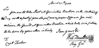 Capt. Bowman, in letter to Col. Hite of July 30, 1778 (Almon's Remembrancer, 1779, p. 82), describes the march and capture as follows: "Marched for Kaskaskia with four days' provisions, and in six days arrived at the place in the night of the 4th instant, having marched two days without any sustenance, in which hungry condition we unanimously determined to take the town, or die in the attempt. About midnight we marched into the town without being discovered. Our object was the fort, which we soon got possession of; the commanding officer (Philip Rocheblave) we made prisoner, and he is now on his way to Williamsburg under a strong guard, with all his instructions from time to time, from the several governors at Detroit, Quebec, etc., to set the Indians upon us, with great rewards for our scalps, for which he has a salary of £200 per year." This statement shows that the fort was in the town, and controverts the assertion of Butler (p. 53) that the public papers in the fort were not captured, out of delicacy to the wife of the commander, she "presuming a good deal on the gallantry of our countrymen by imposing upon their delicacy towards herself." ... "Better, ten thousand times better", Butler adds, "were it so, than that the ancient fame of the sons of Virginia should have been tarnished by insult to a female!"