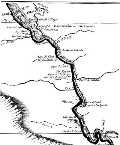 (6.) Lieut. Ross's Map of the Mississippi from the Balise to Fort Chartres, made late in 1765, improved from the French surveys, and published in London in 1775, places "Ft. Caskaskias" at the southeast corner of the town, on the west bank of the river,—the spot indicated in Rocheblave's letter. It shows no fort on the eastern bank.
