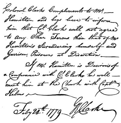 [1512] Bowman gives (p. 105-108) the correspondence with Hamilton, the articles of capitulation, etc., some of which are omitted in Clark's narratives. Hamilton in his Report describes Clark's demand on him to surrender thus: "About eight o'clock a flag of truce from the rebels appeared, carried by Nicolas Cardinal, a captain of the militia of St. Vincennes, who delivered me a letter from Col. Clark requiring me to surrender at discretion; adding, with an oath, that if I destroyed any stores or papers, I should be treated as a murtherer." Hamilton asserts that Clark was supplied with gunpowder by the inhabitants of Vincennes, "his own, to the last ounce, being damaged [by water] on the march;" and that "Clark has since told me he knew to a man those of my little garrison who would do their duty, and those who would shrink from it. There is no doubt he was well informed."
