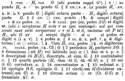 [1] quod demonstravit apparatus prioris editionis criticus. unum hic exemplum afferam, quod verba p. 149, 24 “et ex intestino opere lacunariis ornatus” quae leguntur in GHLS, ea cum P omittunt fpv(b)l(ch). similiter p. 273, 13. 281, 2 etc.