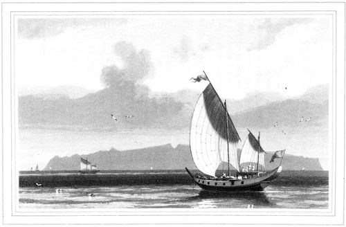On the 8th. we passed the island of Busheab, which, in Heather’s map, is placed much too far to the eastward, and which ought to be called “Khoshaub, or pleasant water,” from the fresh spring in its territory. It is a long and low slip, but the land on the continent behind it is extremely high. We had a light sea breeze all day, that carried us off Cape Nabon, a part of the province of Farz. The thermometer stood at 93° in the cabin after dinner. On the morning of the 9th. it was reported that a fleet of five ships were seen from the mast-head. We conjectured that they might be Arab ships, bound from Muscat to Bussorah, which about this season proceed on their voyages. They carry thither annually eight thousand bales of coffee; and in return get cargoes of dates. The sea breeze of the day was extremely light, and set in at noon. In the evening the Barnhill, a remarkable piece of land, (which derived its name from its resemblance to an old and decayed thatched building, and which is situated over the town of Congoon,) bore N. and by W. of us. Here the whole coast is very high.