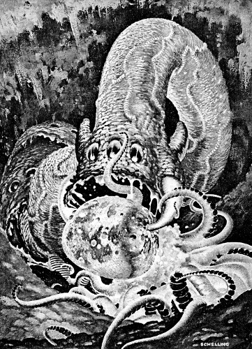 It had been a horrible sight. Where he'd expected to see the abdominal region of his host, just behind the thoracic section, there lay a wet, red concavity, in the midst of gaping jaws. Jerry himself was enhosted in a "tongue" of some still larger creature within that soft earthen burrow! And some remaining fragment of his host's awareness told him that the creature of whom he was the tongue was itself the tongue of yet another creature. He was a segment of some gigantic segmented worm-creature whose origin lay who-knows-how-far beneath the earth.