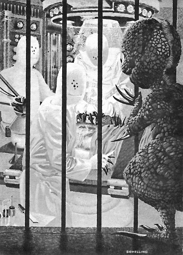"Oh, hell," thought Jerry, cowering weakly against the wall. "If I had a piece of chalk or a charcoal stick I could write something. Or draw a picture, maybe, on the ceiling. Then they'd know I was intelligent, and—They'd probably use me anyhow. The middle of a battle is no time for writing learned scientific papers about new zoological 'finds.'"