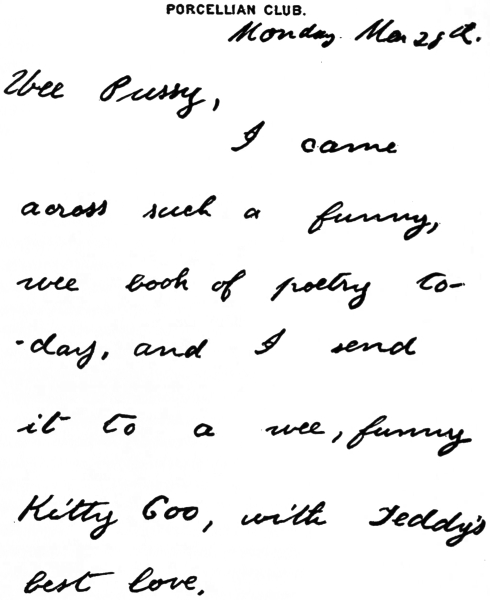 In the midst of all the excitement, we occasionally snatched a moment for a quiet luncheon. “Fine!” he writes me on November 5. “Yes,—Thursday,—the Langdon at 1:30. It will be fine to see Patty Selmes.” How he did enjoy seeing our mutual friend Patty Selmes that day! As “Patty Flandrau” of Kentucky she had married Tilden Selmes just about the time334 that Theodore Roosevelt had taken up his residence in the Bad Lands of Dakota, where the young married couple had also migrated. Nothing was ever more entertaining than to start the “don’t you remember” conversations between my brother and his old friend Mrs. Selmes. Each would cap some wild Western story of the other with one equally wild and amusing, and the tales of their adventures with the Marquis de Morés would have shamed Dumas himself!