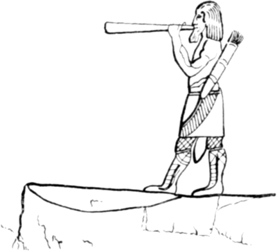 In den Trümmern von Ninive, der Hauptstadt des assyrischen Reiches, fand man unter den vielen Darstellungen aus dem 9. Jahrhundert vor Christus, die dort in Stein gehauen sind, auch die hier abgebildete. Es ist eine Militärperson dargestellt, die von einem erhöhten Platz aus durch ein Sprachrohr Befehle erteilt. Aber auch die Araber kannten das Sprachrohr[S. 16] bereits um das Jahr 1550. Erst im Jahre 1671 wurde das Sprachrohr in einer in London erschienenen Schrift unter der Bezeichnung „Sprech-Trompete“ für Marinezwecke bekannt gemacht.