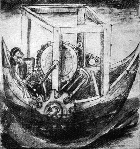 In den technischen Bilderhandschriften des Mittel[S. 17]alters werden die Schwimmgurte immer wieder unter den Kriegsgeräten abgebildet. Leonardo da Vinci rät gar ums Jahr 1480, daß jeder der eine Flugmaschine über dem Wasser versuchen will, einen luftgefüllten Schlauch als Rettungsgurt tragen müsse. Und an einer andern Stelle empfiehlt er aufgeblasene Lederschläuche, mit deren Hülfe „dies Heer den Fluß schwimmend übersetzen soll“.