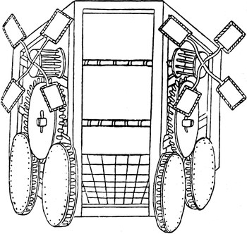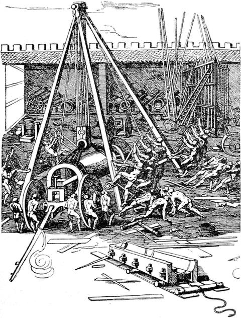 Unter Alexander dem Großen konstruierte der Ingenieur Diades einen Widder, dessen Balken auf einer Reihe kleiner Walzen lagerte, auf denen er mittels Flaschenzügen hin- und hergezogen wurde. Wir haben es hier also schon im 4. Jahrhundert vor Christus mit einer der erst in jüngster Zeit wieder so beliebten[S. 19] Walzenlagerungen zu tun. Die Walzenlager sind mit den Rollen- und Kugellagern verwandt, und dienen wie diese dazu, die Reibung an Maschinen möglichst zu verringern. Also eine anscheinend ganz moderne technische Idee vor über 2200 Jahren!