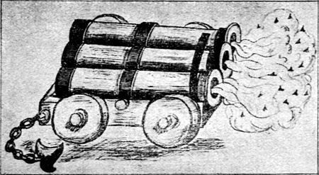 Man kann es sogar beweisen. Thukidides berichtet nämlich, das die Böotier, jenes wegen seiner Plumpheit verrufene Volk im mittleren Griechenland, im Jahre 424 vor Christus eine eigentümliche Angriffswaffe in Stellung brachten. Sie bestand aus einem langen, aus Holz ausgehöhlten und mit Eisenreifen umgebenen Rohr, das auf einem Rädergestell lag. Vorn war ein durchbrochenes Gefäß mit glühenden Kohlen angebracht. Auf die Kohlen warf man Pech und Schwefel. Hinten erzeugten Bälge von großen Tieren ununterbrochen einen starken Luftstrom. Infolgedessen entstand vorn am Rohr eine lange, heftige Stichflamme, die von den Böotiern gegen die hölzernen Befestigungswerke der Stadt Delion gerichtet wurde.