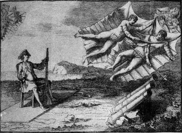 Es ist oft über die Frage gestritten worden, welcher Mensch zuerst geflogen sei. Soweit wir die Geschichte bis jetzt kennen, läßt sich schon von einem Flugversuch im Jahre 67 nach Christi Geburt berichten. Viele altchristliche Schriftsteller erzählen uns, wie damals unter Kaiser Nero ein Zauberer namens Simon einen Flug durch die Luft versucht habe. Dieser Simon wird ja auch im 8. Kapitel der Apostelgeschichte als gefährlicher Zauberer erwähnt. Die großen Kirchenschriftsteller kommen außerordentlich oft auf die Erzählung von dem Flug des Simon zurück. Einige berichten, daß Petrus in dem Tun des Simon eine Verhöhnung und Nachahmung der Himmelfahrt Christi gesehen habe, und daß der Flug durch das Gebet Petri vereitelt worden sei. Deshalb habe Kaiser Nero den Petrus gefangen gesetzt und später kreuzigen lassen.