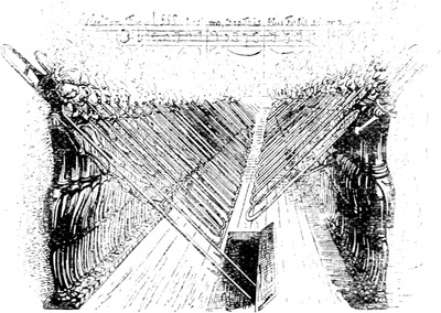 Unter den verschiedenen Verbesserungen, die diese Geschütze im Laufe der Jahrhunderte erlebten, ist diejenige am interessantesten, die ein automatisches Laden ermöglicht. Wir erkennen in unserer Abbildung das auf einer Säule drehbar aufgestellte Geschütz, das auch in seiner Höhenrichtung verstellbar ist. Links, dicht vor der Säule, sehen wir den schweren Holzrahmen, in dem die Spannstränge sitzen. Aus jedem Spannstrang ragt ein starrer Knüppel nach hinten hinaus. Die freien Enden dieser Knüppel sind durch die Sehne verbunden. Die Sehne wird in der Mitte von einem Haken er[S. 27]faßt und durch Drehung des rechts sichtbaren Kreuzes mit Hilfe zweier Gelenkketten langsam gespannt, bis sie sich in der Abzugsvorrichtung festhakt. Gleichzeitig dreht sich bei diesem Vorgang eine Walze, die in dem oberen bügelförmigen Teil des Geschützes lagert. Über dieser Walze ist ein Behälter für Pfeile angebracht. Die Walze ist mit einer Nute versehen, die genau so groß ist, daß ein Pfeil darin Platz hat. Mithin wird die Walze bei jeder Umdrehung, bei jedem Anspannen der Sehne, in ihrer Nute oben einen Pfeil mitnehmen, und ihn nach unten hin auf die Läuferbahn befördern. So kann der Geschützführer also nach jedem Abzug das Geschütz sogleich wieder spannen, ohne sich um die Ladung zu kümmern.