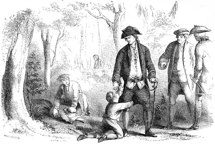 Continuing their route, the Tories fell upon several of the neighbors, all of whom suffered some cruelty at their hands. At one house they placed its master in a chair, tied him down, and built a fire under him, by which means he was at last compelled by his unsupportable agony to reveal the hiding place of his gold. But a terrible retribution was preparing for them. Major Paulding had gathered a party of his men, and was in hot pursuit of them. As the Major was following up their track, he stopped at the residence of Mr. Wright, an old Quaker, who felt a strong sympathy for the American cause, but whose principles prevented him from taking an active part in the contest. To the inquiry, if such a party of Tories as has been described, was seen, the Quaker replied in the affirmative, pointing out the course they had taken.