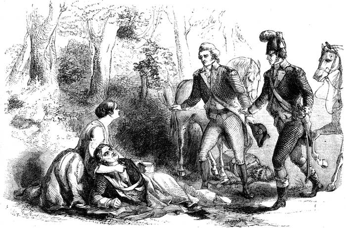 "I knew the spot—the very trees; and the position of the men I knew as if I had seen it a thousand times. I had seen it all night! I saw all at once; but in an instant my whole soul was centered in one spot; for there, wrapped in his bloody guard cloak, lay the body of my husband. How I passed the few yards from my saddle to the spot I never knew. I remember uncovering the head, and seeing a face clothed with gore from a dreadful wound across the temple. I put my hand on the bloody face; 'twas warm, and an unknown voice begged for water."