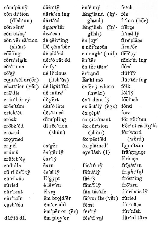 The words in this list are divided into syllables and marked according to Webster’s International Dictionary. The list includes all the more difficult words which occur in the text.
