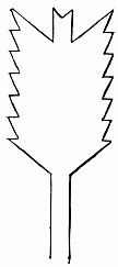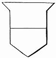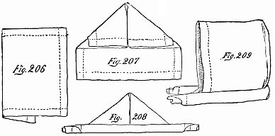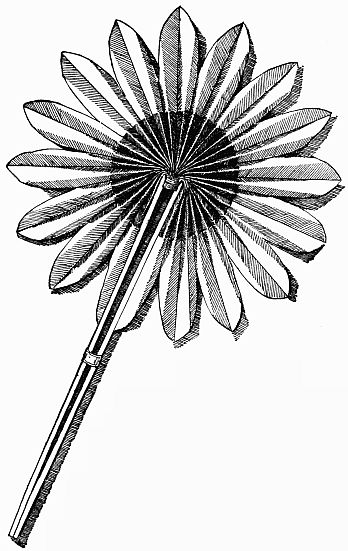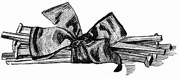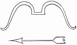 Make Cupid’s bow and arrow of heavy pasteboard, like Fig. 379. Let the bow measure about sixteen inches from tip to tip. Make the arrow twelve inches long, with a point or head three inches, and the feathers two inches, in length on the outside edge. Cut a notch in the feathered end, as shown in Fig. 380.[467] Strengthen the arrow by gluing a thin stick of wood along it to within one inch of the point. Gild both the bow and arrow, tie a silk cord to the tips of the bow, leaving it slack, and force the head of a worsted-needle into the point of the arrow (Fig. 381). Adjust the arrow by fitting the cord in the notch and pulling it back until the cord is taut; then fasten it to the bow by taking a few stitches with yellow silk through the bow and over the arrow. Fig. 382 shows how it should appear when in place.