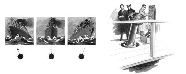 Figure 54 is a photograph of H. M. S. Lion, the flagship of Admiral Beatty in the battle of Jutland. This ship was provided with the Sperry Gyro-Compass equipment early in the war. During the Jutland engagement a fire broke out in a magazine of the Lion immediately below the two Master Compasses which were located in one compartment. It became so hot that the lead sheathing was melted off the electric cables and one of the Gyro-Compasses was heated until its parts fused. Notwithstanding this same heat the other compass functioned throughout the entire action. Of the ships engaged in the battle of Jutland practically all except the destroyers were equipped with the Gyro-Compass. Every one of them performed perfectly throughout the action except in the case of the Lion on which one was destroyed by fire.