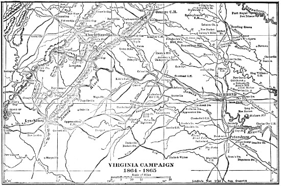 Early in February Lee at Petersburg wrote to the Secretary of War as follows. “All the disposable force of the right wing of the Army has been operating against the enemy beyond Hatcher’s Run since Sunday. Yesterday, the most inclement day of the winter, the men had to be retained in line of battle, having been in 441the same condition the two previous days and nights. I regret to be obliged to state that under these circumstances, heightened by assaults and fire of the enemy, some of the men had been without meat for three days, and all were suffering from reduced rations and scant clothing, exposed to battle, cold, hail, and sleet.... The physical strength of the men, if their courage survives, must fail under this treatment. Our cavalry had to be dispersed for want of forage. Fitz Lee’s and Lomax’s divisions are scattered because supplies cannot be transported where their services are required. I had to bring W.H.F. Lee’s division forty miles Sunday night to get him into position. Taking these facts in consideration with the paucity of our numbers, you must not be surprised if calamity befalls us.” Bad in February, it was no better in March.