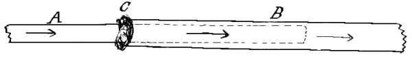 A, the tube from the ozonizer was introduced several inches into B, the tube leading to the U tube, and the joint C was closed by a cement composed of beeswax and paraffin. The carbon monoxide was passed [Pg 46] [Pg 47] through wash bottles containing caustic soda and finally through baryta water. The two gases were then brought together in a U tube placed in an air bath. After leaving the U tube the gases passed through perfectly clear lime water. Under these conditions the current of the gases was continued for an hour, and no precipitate was formed in the lime water.