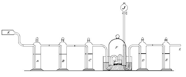 That ordinary commercial sticks of phosphorus contain carbon was shown by us in the following way[30]:—Air was passed from a gasometer into a [Pg 94] [Pg 95] hard glass tube containing copper oxide heated to redness, represented by K in the drawing. Then through a series of wash bottles A, B, C, so constructed that the connecting tubes were fitted into each other by means of ground glass joints. A and B contained a concentrated solution of caustic soda, C a solution of baryta water. The air then passed into an ordinary bell jar, having a capacity of about a litre and a quarter. This was held in position on mercury contained in a crystallizing dish. The inlet tube was bent downward into a small dish containing the phosphorus, represented by H in the figure. The gas after leaving the bell jar passed through two wash bottles D and E, similar to A, B, C. D [Pg 96] [Pg 97] [Pg 98] [Pg 99] contained 30-40 c.c. of ordinary distilled water. E contained a clear solution of baryta water, and was connected with a tube containing solid caustic potash to protect it from the air. The outlet tube from the wash bottle C is bent so as to pass beneath the edge of the bell jar, then up into the closed space above the mercury, and then down towards the phosphorus. A long funnel tube J served to introduce or remove water from the dish containing the phosphorus. The air therefore after having entered the tube K came at no point in contact with organic matter, and yet we found that after all ordinary air had been displaced by purified air, and clear baryta water introduced into [Pg 100] [Pg 101] the wash bottle E, a precipitate was found. Ten litres of air were sufficient to cause a distinct turbidity, while 20 to 30 gave a precipitate. As there is no possible source of error it follows that the carbon dioxide must have come from the oxidation of carbon contained in the phosphorus.
