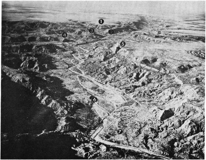Fig. 1. Aerial view of Palo Duro Canyon showing location of major points of interest: (1) Coronado Lodge; (2) Triassic Peak; (3) Timber Mesa; (4) Capitol Peak; (5) Fortress Cliff; (6) Prairie Dog Town Fork of Red River; (7) The Turnaround (termination of Park Road 5). (Courtesy of Charles A. Wolfin; photograph by W. A. Hester.)