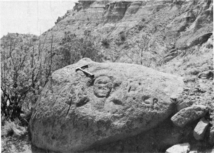 Various tribes of Plains Indians of historic times also used Palo Duro Canyon as a camping ground. The presence of these Indians is known from many campsites and burials. In addition, flint chips and stone artifacts, potsherds, ornaments of shell and bone, grinding slabs, stone mortars (fig. 15), and a few pictographs (fig. 3) have provided considerable information about the culture of these people. Among the tribes believed to have frequented the canyon at various times are the Apaches, Cheyennes, Arapahos, Kiowas, and Comanches. However, it is the Comanches who are most closely associated with the Palo Duro area, for the canyon is located near the center of their last homeland. Indeed it was here that the Comanches were finally defeated and driven from this part of the Plains. The battlefield where Colonel Ranald Mackenzie’s troops fought the Comanches is located near the southeast corner of the park (see fig. 7). This skirmish, which took place in 1874, is believed to have been the last major Indian battle in Texas.