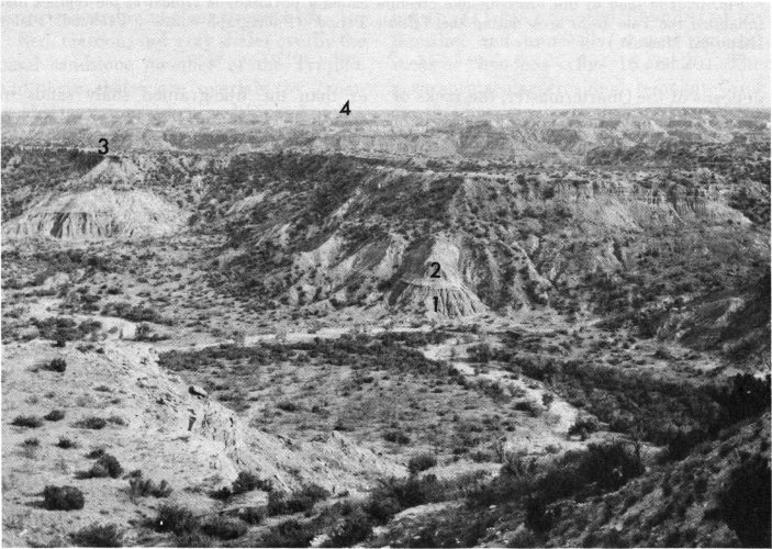 Fig. 12. Taken from the northwest rim near Coronado Lodge, this photograph shows the four major rock units exposed in the park: (1) The Quartermaster Formation which forms the lower wall and canyon floor; (2) Tecovas Formation; (3) Trujillo Formation which caps the mesas; and (4) Ogallala Formation.