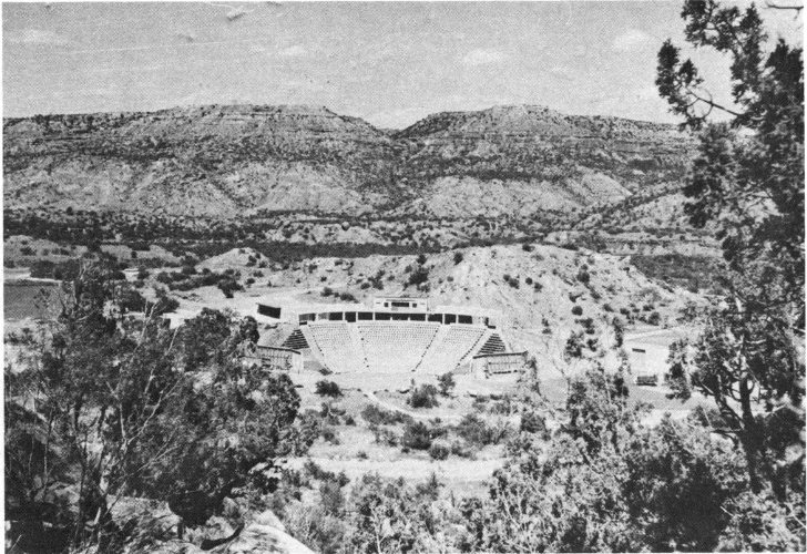 Today’s visitor to Palo Duro Canyon can re-live some of the fascinating history of this interesting area. One can still see a replica of Colonel Goodnight’s primitive dugout, follow the faint trace of the Comanche Trail, or perhaps find the fossil bones of prehistoric creatures that lived hundreds of thousands—even millions—of years ago. But most visitors to Texas’ most colorful canyon are not attracted by its interesting history. They come instead to enjoy the scenery and recreational opportunities that are present. These are readily accessible, for a carefully engineered, hard-surface road leads from the rim of the canyon to the canyon floor. There are campgrounds, picnic areas, concessions, and even an outdoor theatre (fig. 23). The location of these facilities and some of the canyon’s more interesting geologic features are shown on the generalized place map of the canyon (fig. 2).