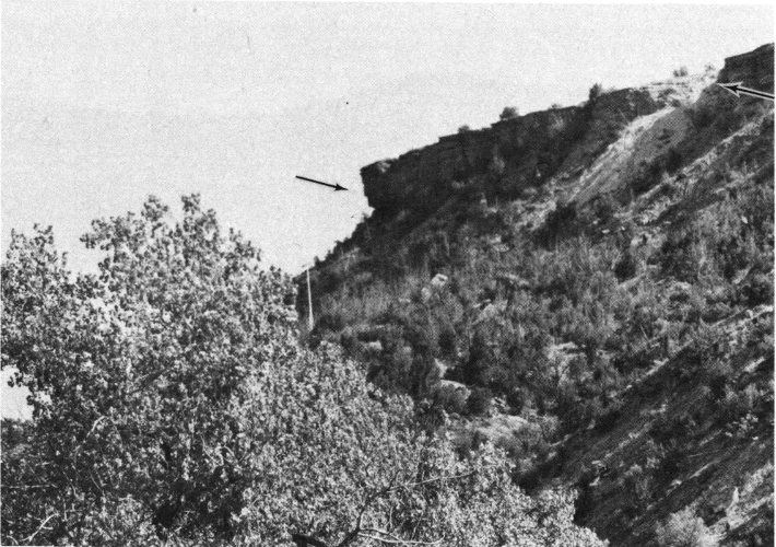Fig. 35. The Devil’s Slide in the south end of the park is an eroded spur of Tecovas shales. Some of the “slides” made by visitors are indicated by the arrow.