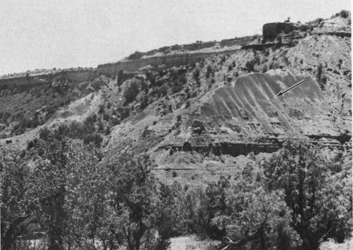 Fig. 9. Sagging beds of Quartermaster Formation have produced this gentle syncline, or downfolding, in the rocks. The “dome” on Capitol Peak can be seen in the background.