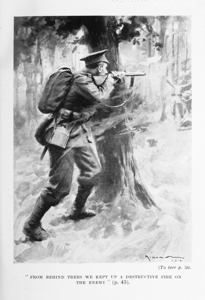 Retiring, we took up a position behind a wood, and were thinking that we should get a bit of a rest, when a German aeroplane came flying over us, gave our hiding-place away, and brought upon us a fire that drove us out and sent us back to three lines of trenches which we had been occupying.