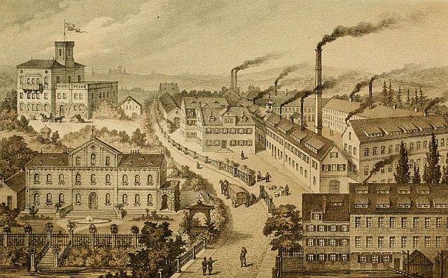 On the very spot, where once the little house stood, the extensive factory premises are now erected on either side of the Rednitz, the water power of which river proving too insufficient and fluctuating, steam had to be called into requisition and a large engine erected.