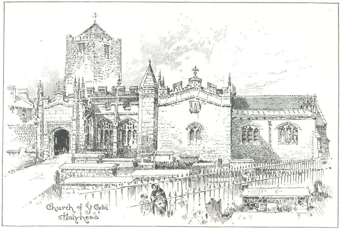 Since Mr. Grose described the Church of St. Cybi with pen and pencil 111 years ago many changes have taken place. The shore below the church has been reclaimed from the sea, the lower churchyard has been added to the original enclosure, a broad road separates it from the present harbour, and where the tide once flowed, under the old churchyard wall, the extensive buildings of the London and North Western Railway Company now stand. Steamers and trains laden with passengers and merchandise passing to and from Ireland and America crowd the once lonely shore; and the town and its population have grown with the growth of trade. The very aspect and dress of p. 16the people have changed, the picturesque high-crowned hats and long cloaks have disappeared, only the Welsh language remains, “Yr hen iaith Gymraig,” nor does it diminish its hold on the affections of the people.