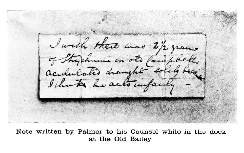 But let me hasten to a close. I am so heartbroken, so wearied out with fatigue, and pain, and grief; I am so utterly disgusted by these enumerations that I feel I cannot go on. From the first to the last my brother had no chance. You introduced him to the jury as a forger in the following words:—“There has been evidence which certainly implicates the prisoner in transactions of a very discreditable nature. It appears that he had forged a great many bills of exchange, and that he had entered into transactions not of a reputable nature.” If all this was irrelevant why did you introduce it? In the same tone was your allusion to the “student’s book,” which even the Crown abandoned. “This book has been laid before you in evidence, and certainly I think I need hardly beg of you to pay no regard to it, because it was a book that Palmer had when he was a surgeon, and at a time when I have no doubt he would have shrunk with horror at any such crime as that with which he is charged here to-day. There is, in the title page of the book, ‘Strychnia kills by causing tetanic fixing of the respiratory muscles,’ and in another part there is a description of what nux vomica is, and how strychnia is produced from it, with these words—‘Strychnia kills by causing tetanic fixing of the respiratory muscles.’ Again I say that I think this being found in his possession ought not to weigh at all against the prisoner at the bar” (report, p. 315). If it ought not to weigh against him, why, in Heaven’s name, did you so solemnly drag it in? Why did you read and re-read it? Would it not have been fairer to put it aside altogether than to impress it on the minds of the jury, and then tell them it ought not to weigh at all? Is it possible to believe you were sincere? Is it possible the jury could have drawn any other conclusion from your dwelling on it than that you wished them to regard it as proof of guilt?